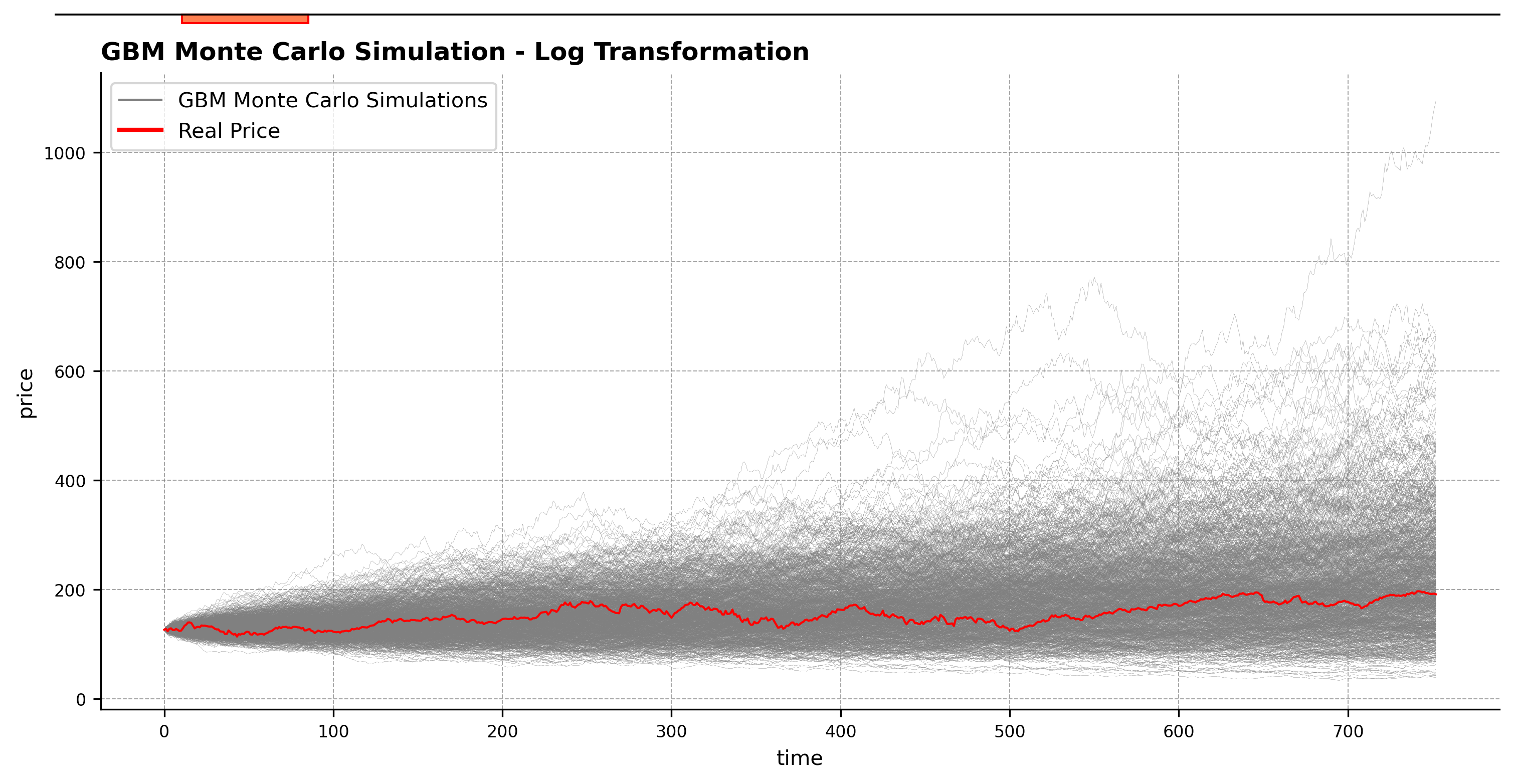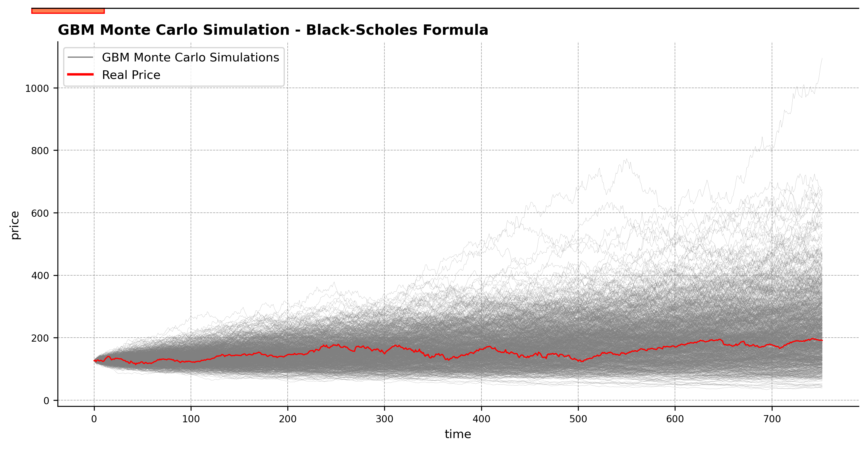 import numpy as np import pandas as pd import yfinance as yf import matplotlib.pyplot as plt from matplotlib.lines import Line2D apple = yf.download('AAPL', '2021-1-1','2024-1-1') apple.columns = apple.columns.levels[0] price = apple.Close returns = price.pct_change().dropna() t = len(returns) dt=1 mu = returns.mean() sigma = returns.std() geom_mu = ((returns+1).prod())**(1/t)-1 simulations = 1000 S0 = price[0] def GBMpaths(mu, sigma, W): return np.exp((mu-0.5*sigma**2)*dt+sigma*np.sqrt(dt)*W) Ws = np.random.standard_normal(size=(simulations,t)) GBM_matrix = GBMpaths(mu,sigma,Ws) GBM_matrix = np.insert(GBM_matrix,0,S0,axis=1).cumprod(axis=1) xAxis = range(0,t+1) fig, ax = plt.subplots(figsize=(12, 5.5)) for n,i in enumerate(range(1,simulations)): plt.plot(xAxis,GBM_matrix[n],color='grey', linewidth=0.1) plt.plot(xAxis,price,color='red',linewidth=1)